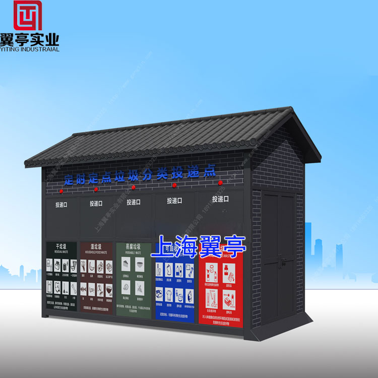 垃圾分類房介紹:一款純黑色小尺寸垃圾分類房投入市場(chǎng)使用。采用純黑色的垃圾房并不多見(jiàn),但是我們上海翼亭垃圾房廠家爭(zhēng)取給大家更多與眾不同的垃圾分類房款式參考和選擇。這款純黑色垃圾分類房前面設(shè)置了5個(gè)垃圾投放窗口,側(cè)面開(kāi)門(mén),方便垃圾桶以及工作人員進(jìn)出。垃圾分類房的頂部更是采用了琉璃瓦,不但實(shí)用也為整個(gè)垃圾房增添光彩!